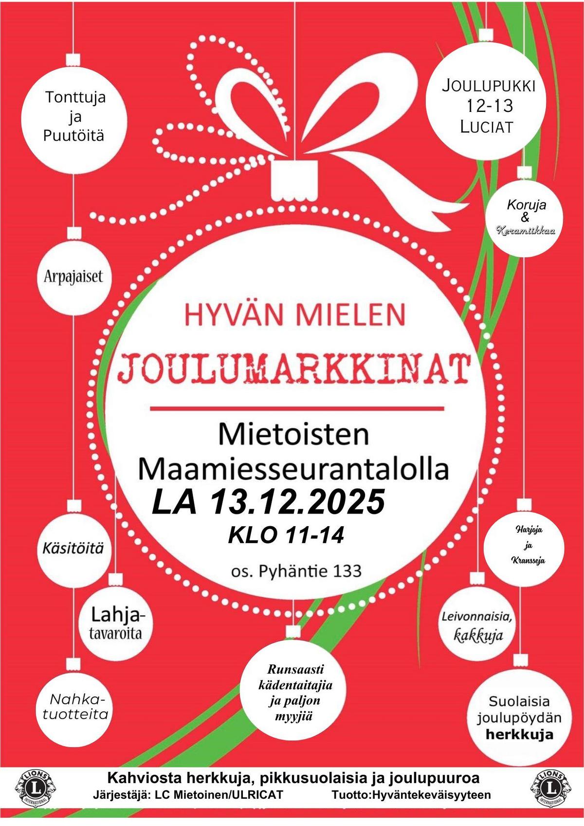 Hyvän mielen Joulumarkkinat Mietoisten Maamiesseurantalolla lauantaina 13.12.2025 klo 11-14.
